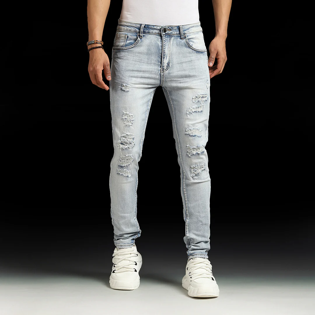 Update your wardrobe with the sophisticated and exclusive Waimea Mens Skinny Jeans with rips and repair from top to bottom. Crafted in the classic blue or vintage wash color, these jeans offer a sleek and modern silhouette that effortlessly elevates any outfit.