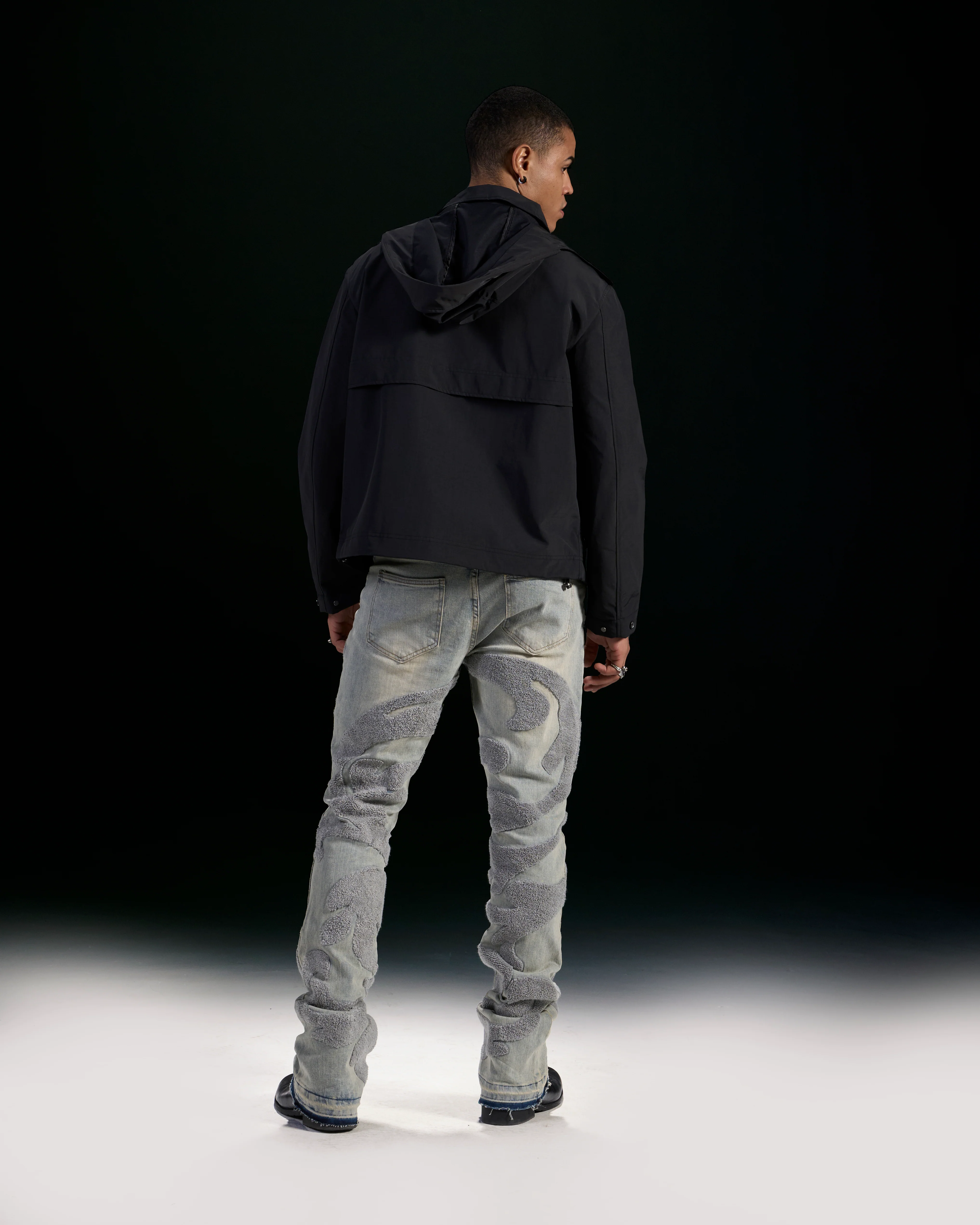 Men's Stacked Fit Jeans. Made with high-quality woven denim and a blend of cotton, polyester, and spandex, these jeans provide a comfortable fit. The black chenille patches give a unique touch to the jet black and bleach wash jeans for a stylish and fashionable look.