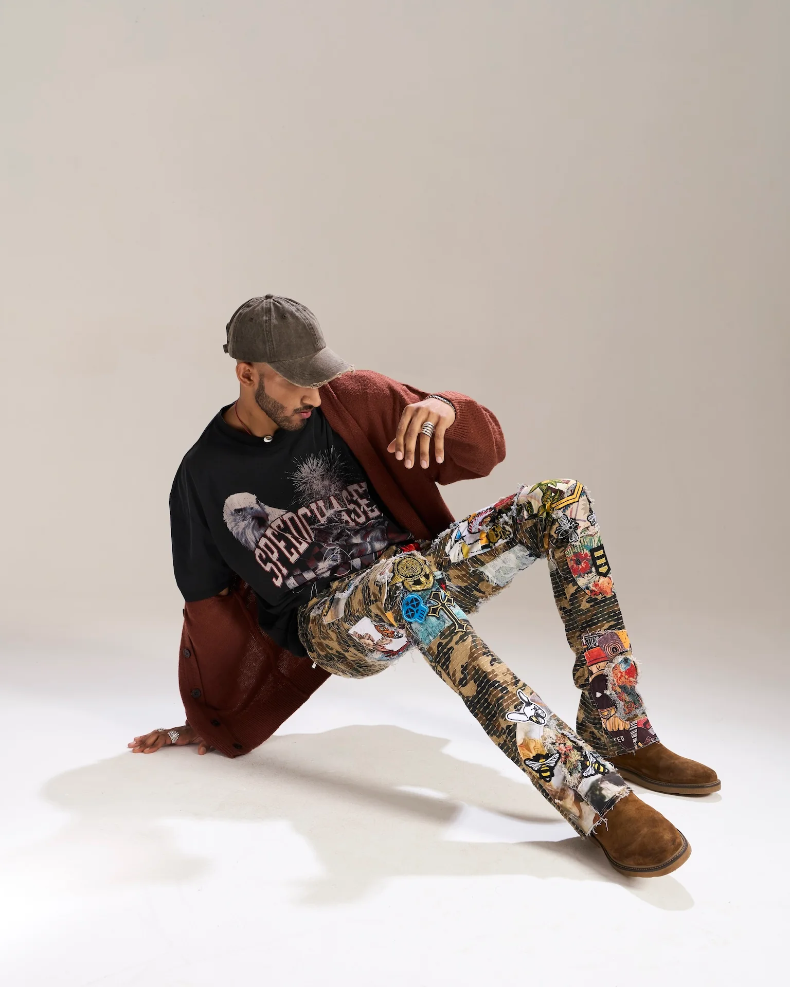Made with woven twill fabric, these jeans feature a unique stacked fit with camo patches stitched all over. Get the perfect blend of style and comfort with 97% cotton and 3% spandex.