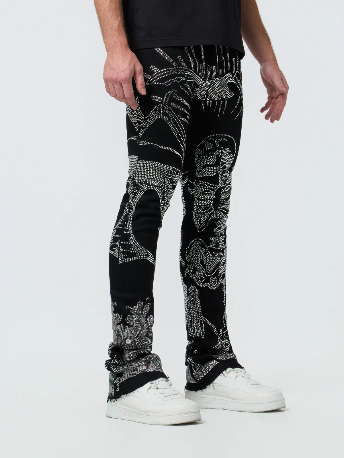 Make a bold statement in these stacked jeans, featuring all-over front and back graphic prints with rhinestone-studded details for serious visual impact. Intricate designs showcase a skeleton, snake, and knife motif that brings edgy, streetwear energy to life. Available in Jet Black, White, and Dirty Vintage — built to turn heads with every step.