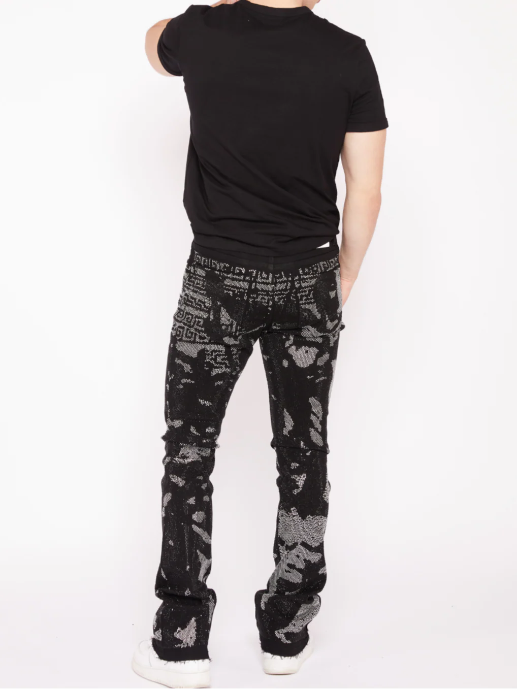 Elevate your style with these Jet Black Stacked Jeans, featuring a stunning all-over rhinestone graphic design on the front and back for a bold, eye-catching look.
