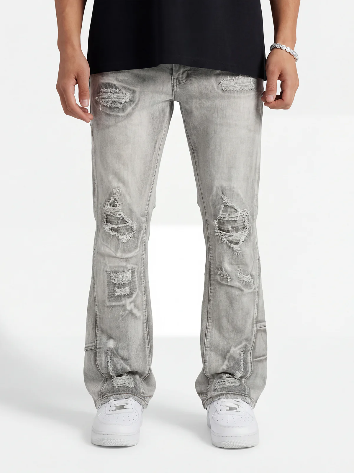 Step out in style with Waimea Men's Flare Jeans, featuring bold bleached highs and lows for a striking contrast. The playful rips and repairs add character, while the blue wash and grey bleach blend effortlessly for a unique, vintage-inspired look.